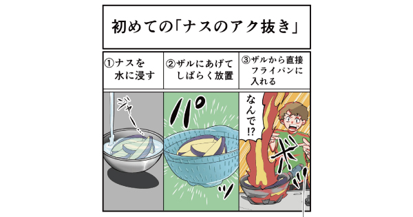 「お料理初心者だったころの失敗談」を伺う読者募集企画。今回は「ナスのアク抜き」のお話。油と相性の良い野菜ですが……火柱は怖いなあ。