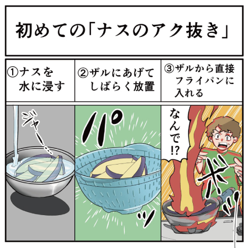 ナスの調理はその日が初めて。加熱前にアク抜きを行い、「ナスを水に浸す→ザルにあげてしばらく放置→ザルから直接フライパンに入れる」という工程で進めていったのですが、フライパンから1メートルほどの火柱が上がって前髪が燃えました。