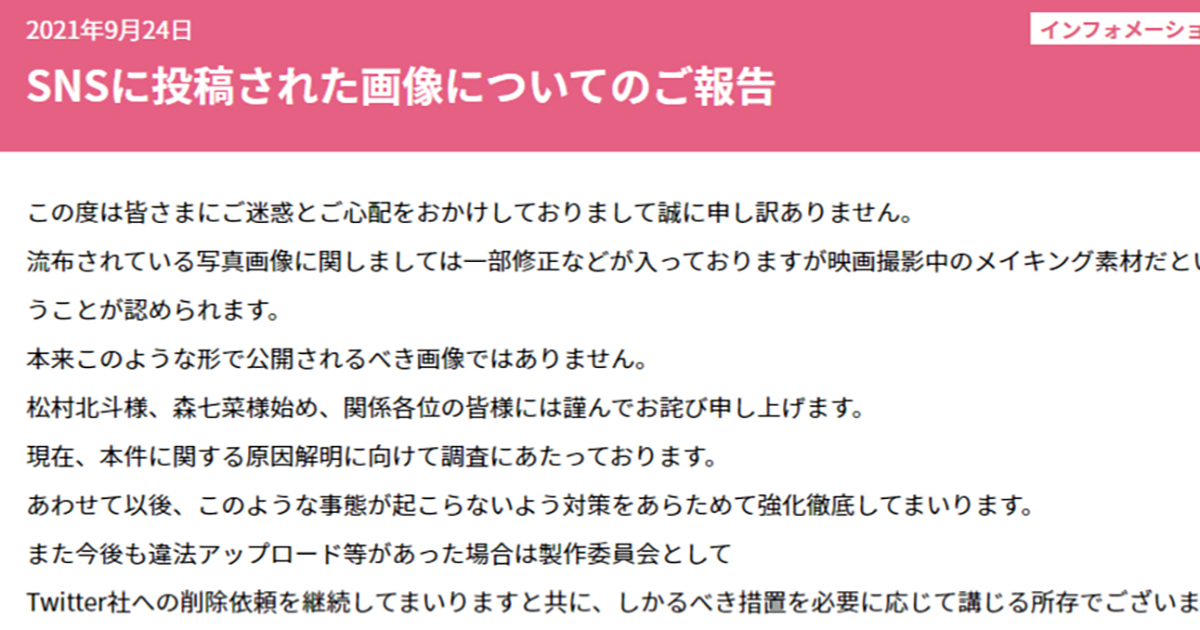 これを受け、「この度は皆様にご迷惑とご心配をおかけしておりまして誠に申し訳ありません」と公式サイトが謝罪。当該の2ショットについては「一部修正などが入っておりますが映画撮影中のメイキング素材だということが認められます」としており、「本来このような形で公開されるべき画像ではありません」と意図せぬ形で流出してしまった写真であることを説明しています。