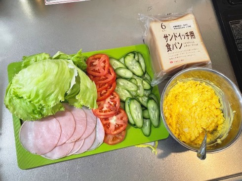 というわけで、実際そこまでうまくいくのか、早速サンドイッチを作って実験してみます。今回はハムと卵サラダのほか、レタスときゅうり、そしてトマトという、いかにもサンドイッチっぽい具を用意してみました。卵サラダはこぼれてしまいがちですが、トマトもなかなか水っぽい野菜。家庭で用意するとどうしても汁気がこぼれてきがちです。それも防げるならありがたい……!