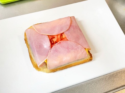 続いて、ちょうちんあんこうさんのやり方で作ってみることに。まず四方にハムを置き、具を乗せて畳んでからもう一枚のパンで挟んで完成。やってみて分かったんですが、折りたたんだ時にハムと具がくっついた方が作業しやすい。一番上の具をトマトや卵サラダなど、ちょっと水分が多いものにすると、よりハムと具が密着してベターです。
