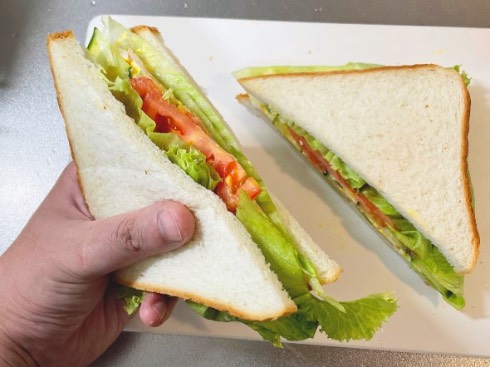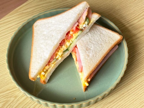 というわけで、4方向から具材を包んでサンドイッチを作るなら、やっぱりハムを使うのが一番良さそう……という結論となりました。これを応用すれば、サルサなど汁気が多めの具も簡単にサンドイッチにできるかも。また、今回は試しに斜めに切ってみましたが、実際に食べる場合は切らない方が食べやすいと思います。とにかく具材がこぼれにくくなるのは事実なので、皆さんも試してみてくださいね!
