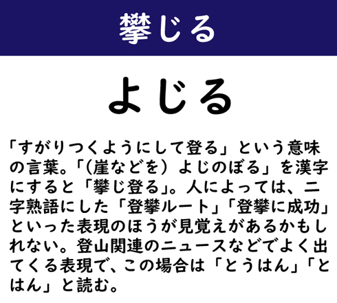 「すがりつくようにして登る」という意味の言葉。「(崖などを)よじのぼる」を漢字にすると「攀じ登る」。人によっては、二字熟語にした「登攀ルート」「登攀に成功」といった表現のほうが見覚えがあるかもしれない。登山関連のニュースなどでよく出てくる表現で、この場合は「とうはん」「とはん」と読む。