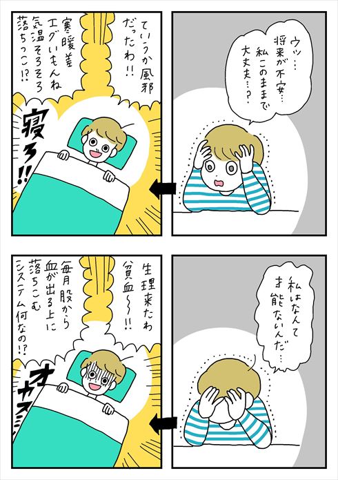 「このままで大丈夫……?」と将来の不安にさいなまれる竹内さん。実は寒暖差で風邪を引いていました。またあるときは才能がないと嘆いていた竹内さんですが、生理で貧血になっていました。