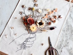 花束が描かれたコットンタペストリーにドライフラワーのお花を貼りつけて変身させるキット。立体的なお花が華やかで目をひきます。お花はボンドで接着するので、大人はもちろん子どもでも楽しめます。