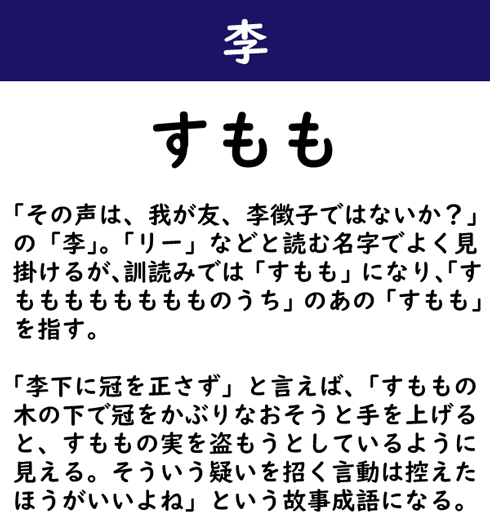 「その声は、我が友、李徴子ではないか?」の「李」。「リー」などと読む名字でよく見掛けるが、訓読みでは「すもも」になり、「すもももももももものうち」の、あの果物の「すもも」を指す。「李下に冠を正さず」と言えば、「すももの木の下で冠をかぶりなおそうと手を上げると、すももの実を盗もうとしているように見える。そういう疑いを招く言動は控えたほうがいいよね」という故事成語になる。