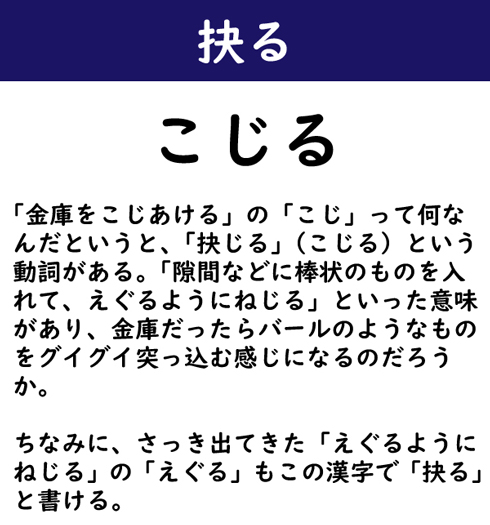 「金庫をこじあける」の「こじ」って何なんだというと、「抉じる」(こじる)という動詞がある。「隙間などに棒状のものを入れて、えぐるようにねじる」といった意味があり、金庫だったらバールのようなものをグイグイ突っ込む感じになるのだろうか。ちなみに、さっき出てきた「えぐるようにねじる」の「えぐる」もこの漢字で「抉る」と書ける。