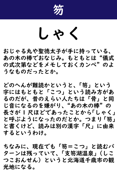おじゃる丸や聖徳太子が手に持っている、あの木の棒でおなじみ。もともとは“儀式の式次第などをメモしておくカンペ”のようなものだったとか。どのへんが難読かというと、「笏」という字にはもともと「こつ」という読み方があるのだが、昔のえらい人たちは「骨」と同じ音になるのを嫌がり、“あの木の棒”の長さが1尺ほどであったことから「しゃく」と呼ぶようになったのだとか。つまり「笏」と書くけど、読みは別の漢字「尺」に由来するというわけ。ちなみに、現在でも「笏=こつ」と読むパターンは残っていて、「支笏湖温泉」(しこつこおんせん)というと北海道千歳市の観光地になる。