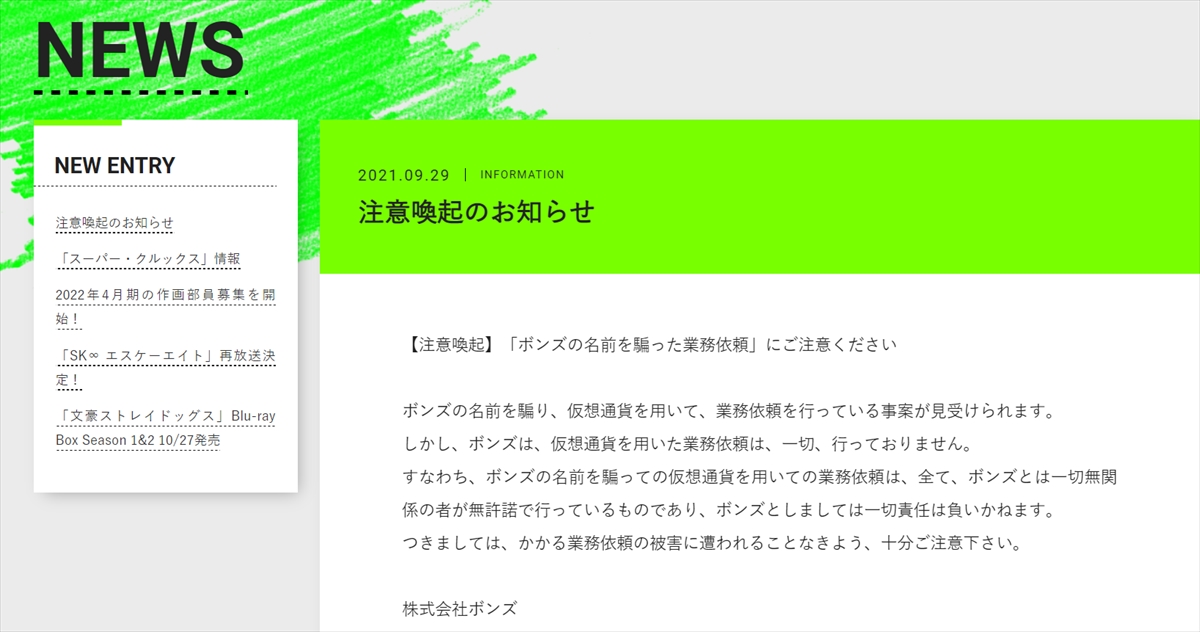 アニメーション制作会社ボンズが、「ボンズの名前を騙った業務依頼にご注意ください」と公式サイトで注意喚起しています。