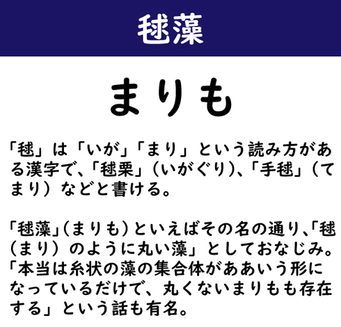 「毬」は「いが」「まり」という読み方がある漢字で、「毬栗」(いがぐり)、「手毬」(てまり)などと書ける。「毬藻」(まりも)といえばその名の通り、「毬(まり)のように丸い藻」としておなじみ。「本当は糸状の藻の集合体がああいう形になっているだけで、丸くないまりもも存在する」という話も有名。