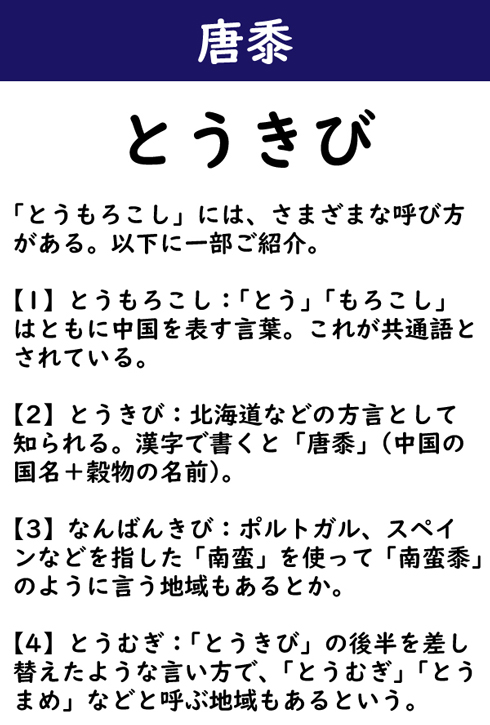 【2】とうきび:北海道などの方言として知られる。漢字で書くと「唐黍」(中国の国名+穀物の名前)。