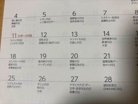 例年、10月第2月曜日はスポーツの日で祝日となっています。しかし2021年は東京オリンピック開催に伴ってスポーツの日は7月23日に移動。紙のカレンダーの多くは修正が間に合わずに10月11日が祝日として記載されているので要注意です。