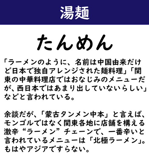 「ラーメンのように、名前は中国由来だけど日本で独自アレンジされた麺料理」「関東の中華料理店ではおなじみのメニューだが、西日本ではあまり出していないらしい」などと言われている。余談だが、「蒙古タンメン中本」と言えば、モンゴルではなく関東各地に店舗を構える激辛“ラーメン”チェーンで、一番辛いと言われているメニューは「北極ラーメン」。もはやアジアですらない。