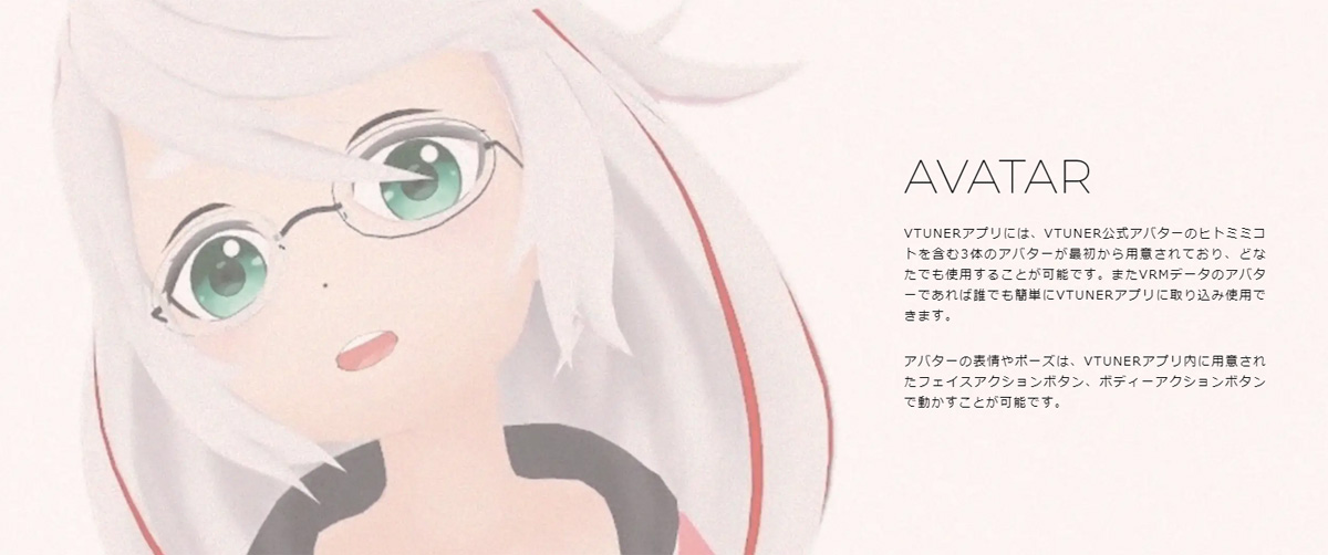 使用可能なアバターは、公式アバターの「ヒトミミコト」を含めて3体が最初から利用可能。また、VRMデータを取り込んで自分の好きなアバターを使用することもできるとのことです。サービスの提供は11月下旬を予定。なお、サイトを見るかぎり今のところiOS用アプリのみ発表されており、Androidについては不明です(標準アプリの方は11月よりAndroid版提供予定)。