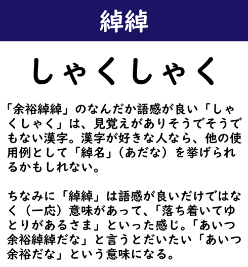 「余裕綽綽」のなんだか語感が良い「しゃくしゃく」は、見覚えがありそうでそうでもない漢字。漢字が好きな人なら、他の使用例として「綽名」(あだな)を挙げられるかもしれない。ちなみに「綽綽」は語感が良いだけではなく(一応)意味があって、「落ち着いてゆとりがあるさま」といった感じ。「あいつ余裕綽綽だな」と言うとだいたい「あいつ余裕だな」という意味になる。