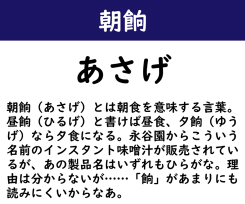 朝餉(あさげ)とは朝食を意味する言葉。昼餉(ひるげ)と書けば昼食、夕餉(ゆうげ)なら夕食になる。永谷園からこういう名前のインスタント味噌汁が販売されているが、あの製品名はいずれもひらがな。理由は分からないが……「餉」があまりにも読みにくいからなあ。