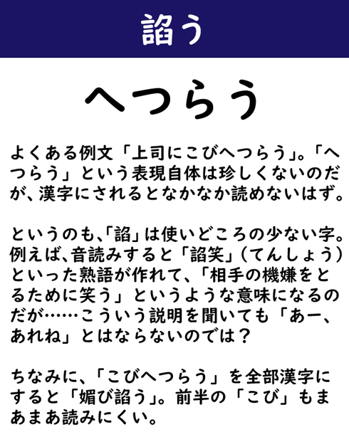 よくある例文「上司にこびへつらう」。「へつらう」という表現自体は珍しくないのだが、漢字にされるとなかなか読めないはず。というのも、「諂」は使いどころの少ない字。例えば、音読みすると「諂笑」(てんしょう)といった熟語が作れて、「相手の機嫌をとるために笑う」というような意味になるのだが……こういう説明を聞いても「あー、あれね」とはならないのでは? ちなみに、「こびへつらう」を全部漢字にすると「媚び諂う」。前半の「こび」もまあまあ読みにくい。