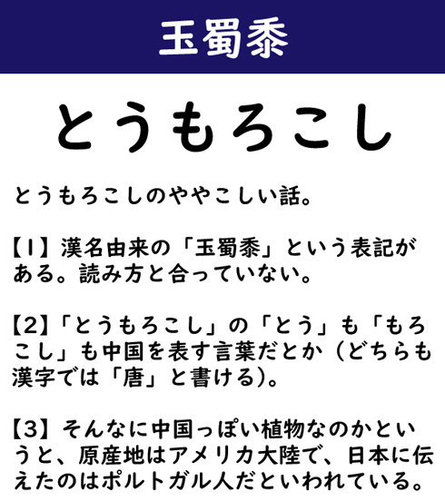 とうもろこしのややこしい話。【1】漢名由来の「玉蜀黍」という表記がある。読み方と合っていない。【2】「とうもろこし」の「とう」も「もろこし」も中国を表す言葉だとか(どちらも漢字では「唐」と書ける)。【3】そんなに中国っぽい植物なのかというと、原産地はアメリカ大陸で、日本に伝えたのはポルトガル人だといわれている。
