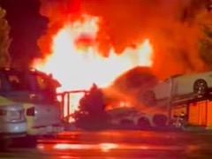 Facebookに投稿された映像には、トレーラーが激しく炎上している様子が捉えられており、何かが爆発してパーツらしきものが吹き飛んでいく様子も映し出されています。特に前方部分の炎の勢いは凄まじく、撮影されたときには中央部分も炎に包まれていました。
