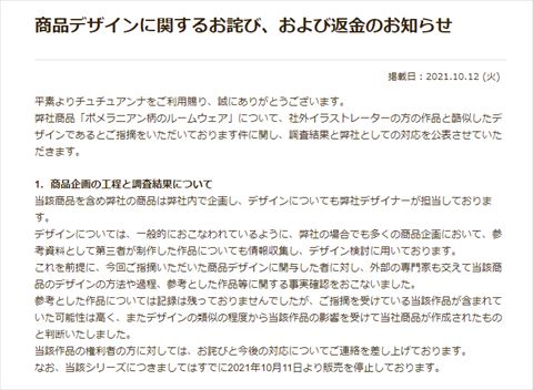 発端となった「ポメラニアン柄のルームウェア」は、指摘のあった作品の影響を受けたとしています。
