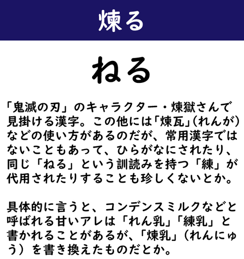 「鬼滅の刃」のキャラクター・煉獄さんで見掛ける漢字。この他には「煉瓦」(れんが)などの使い方があるのだが、常用漢字ではないこともあって、ひらがなにされたり、同じ「ねる」という訓読みを持つ「練」が代用されたりすることも珍しくないとか。具体的に言うと、コンデンスミルクなどと呼ばれる甘いアレは「れん乳」「練乳」と書かれることがあるが、「煉乳」(れんにゅう)を書き換えたものだとか。