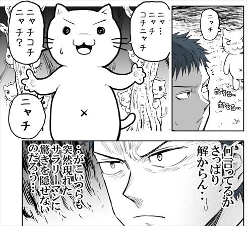 仕事がつらくて屋上から飛び降りたサラリーマン。気がつけば異世界としか思えない場所で、ネコのような生き物に囲まれていました。姿はネコのようだけど二足歩行する、「ニャチ」「ニャンチ」と鳴く謎の生き物たちを、サラリーマンは「ニャンチ」と名付けます。