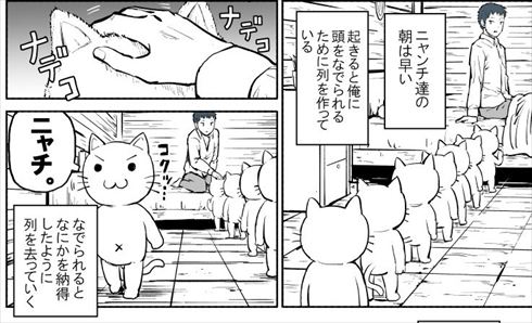 漫画では、サラリーマンがニャンチと過ごす、シュールでかわいい日々が描かれています。うどんが好物だったり、こっそり竹馬の練習をしていたりと、ニャンチの生態はめっちゃ謎。でもかわいい。毎朝列をなすニャンチをなでなでしているサラリーマンがうらやましい……!