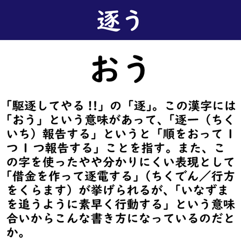 「駆逐してやる!!」の「逐」。この漢字には「おう」という意味があって、「逐一(ちくいち)報告する」というと「順をおって1つ1つ報告する」ことを指す。また、この字を使ったやや分かりにくい表現として「借金を作って逐電する」(ちくでん/行方をくらます)が挙げられるが、「いなずまを追うように素早く行動する」という意味合いからこんな書き方になっているのだとか。
