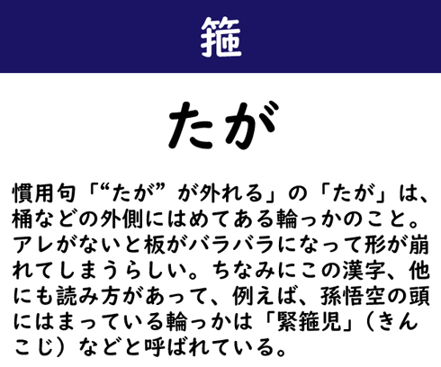 慣用句「“たが”が外れる」の「たが」は、桶などの外側にはめてある輪っかのこと。アレがないと板がバラバラになって形が崩れてしまうらしい。ちなみにこの漢字、他にも読み方があって、例えば、孫悟空の頭にはまっている輪っかは「緊箍児」(きんこじ)などと呼ばれている。