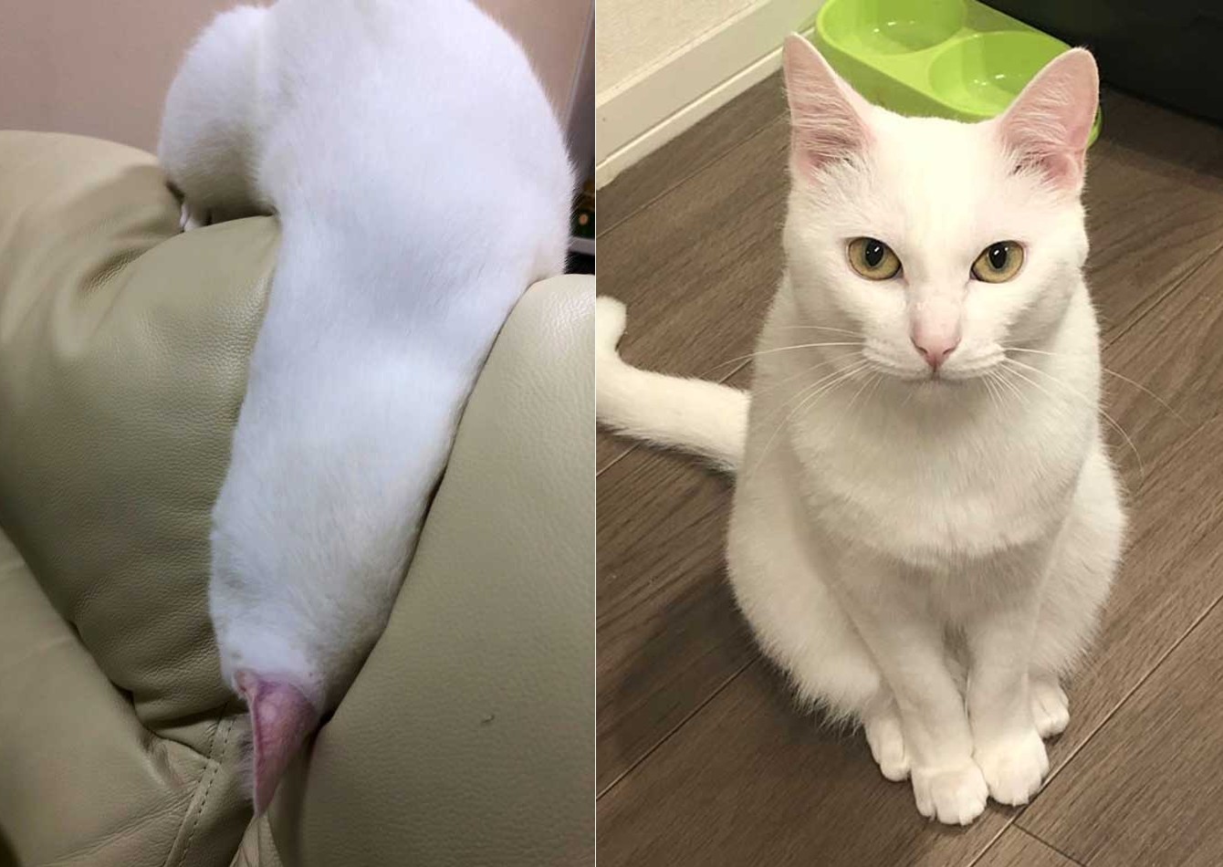 ソファからぐにゃりと垂れる白いモフモフの正体は、白猫の男の子「ハク」くん。飼い主(@hakuponia89)さんによると、ソファの隙間に挟まったおもちゃを取ろうとした結果とのこと。解説と途中の写真がなかったら分からなかったかも……。