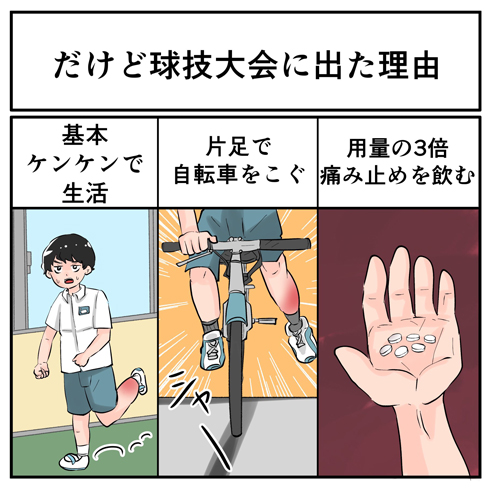試合当日になっても脚の痛みは引きませんでしたが、欠員が出るとチームが出場停止になりかねないため、靴の中に大量のティッシュを詰め、用量の3倍の痛み止めを飲んで、参加しました。