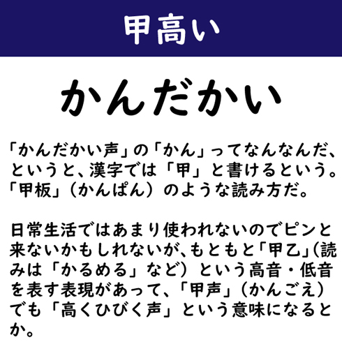 「かんだかい声」の「かん」ってなんなんだ、というと、漢字では「甲」と書けるという。「甲板」(かんぱん)のような読み方だ。日常生活ではあまり使われないのでピンと来ないかもしれないが、もともと「甲乙」(読みは「かるめる」など)という高音・低音を表す表現があって、「甲声」(かんごえ)でも「高くひびく声」という意味になるとか。