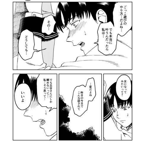 その日の放課後、本原は丘谷に「男に…なってみる気……ない?」と“体が入れ替わるおまじない”を持ち掛けてきます。