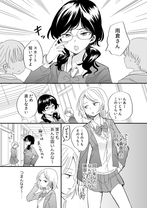 クールな表情にちょっとキツい口調、他の生徒たちのイヤな顔をものともせず、学校のルールを守るよう注意していく真面目な日向さん。いわゆる委員長タイプの彼女に対し、けだるげでちょっとギャルっぽい同級生・雨倉さんは「くそ真面目の日向」「家でもあんな固いんかな〜」という印象。まるで水と油のような、対照的な2人組です。