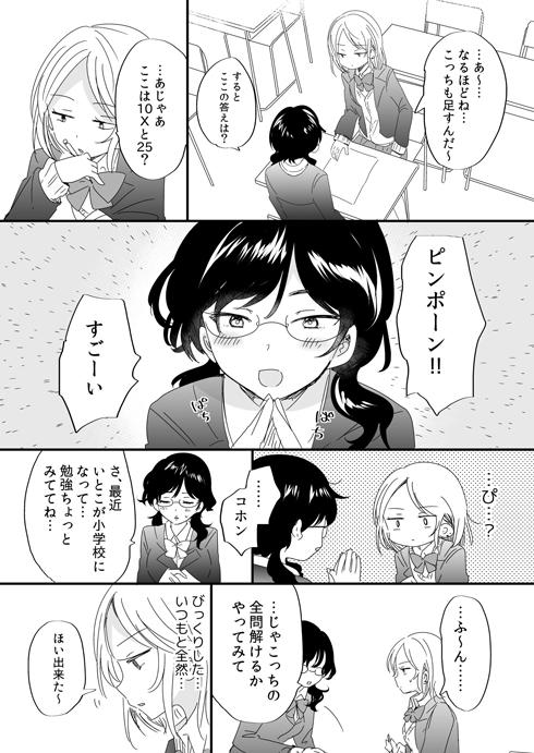 雨倉さんが小テストで悪い点数を取ってしまったあるとき、日向さんは勉強を教えると申し出。「貴方(あなた)ならすぐわかるから5分だけ」という一言に負けて、しぶしぶ席につく雨倉さん。教わりながら問題を解いていると日向さんの様子が一変し、思わず目がテンになってしまいます。