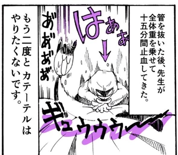 こうして始まった入院生活。手足の運動や、言語・記憶のチェック、検査のためのカテーテル挿入など、目まぐるしいリハビリや治療の様子を軽妙かつ具体的に振り返り。さらに、もし利き腕がマヒして漫画が描けなくなっていたらと想像し凍りつく場面や、両親がお見舞いに来てお母さんがポロポロ泣き出してしまう場面など、実感の伴った描写でも揺さぶってきます。