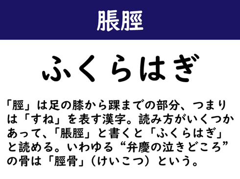 「脛」は足の膝から踝までの部分、つまりは「すね」を表す漢字。読み方がいくつかあって、「脹脛」と書くと「ふくらはぎ」と読める。いわゆる“弁慶の泣きどころ”の骨は「脛骨」(けいこつ)という。