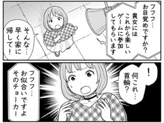 ゲームのために連れてこられた女性の首には、いつの間にかチョーカーが。天の声は「フフフ……お似合いですよ」と、意味ありげに笑います。これもしかして、ゲームに負けると爆発する感じのやつ!?