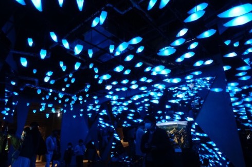 階段を登って入場ゲートから中に入ると、まずは「CAVE/はじまりの洞窟」というエリアに。なにやらカクカクした壁には鏡が貼られ、天井からは魚っぽい形のオブジェがたくさんぶら下がっております。そしてこのオブジェの色が、タイミングによって変わる! 赤っぽくなったり青っぽくなったりして、なるほどこれは確かに幻想的。一発目からカマしてきたな、アトア……。