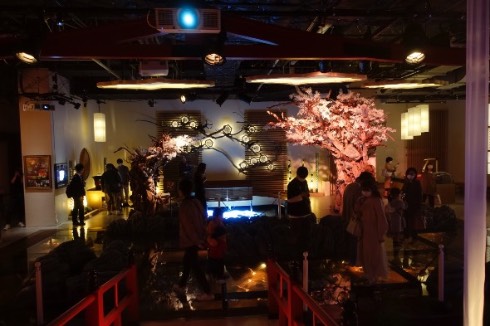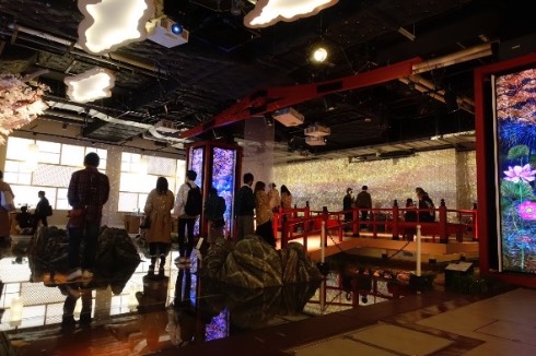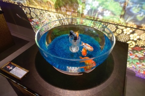 しかしガラス張りの床の下を鯉が泳ぐ上に日本風の橋がかかり、プロジェクターの投影を駆使した作品まで見られるというこのエリアは、「侘び寂び」というより『キル・ビル』の青葉屋というか、ナイトシティのジャパンタウンというか、ほぼニンジャスレイヤー。サイバーパンク小説に出てくる超すごい日本庭園といった趣です。