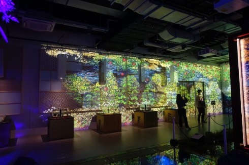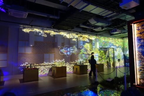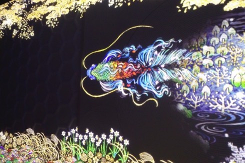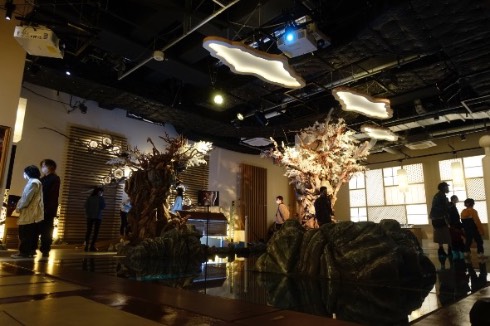 前述の通り、ここではプロジェクターを使った切り絵の投影、「にほはしき時の巡り」が楽しめます。切り絵と光の演出を組み合わせた作品を多数発表している酒井敦美さんによる作品で、フロアの周囲の壁面を極彩色の「花咲案内魚」が泳ぎ、その動きに連れて鮮やかな四季の風景が広がっていくというもの。