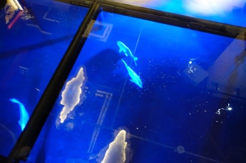 このAQUA TERRAでは、音とミストとレーザーによるパフォーマンス「AQUA UNIVERSE」が定期的に上演されています。これがもう全部シャッターチャンスというか、何がなんでも来た人間に「すげえ……」と思わせて帰すぞという気合いを感じるものになっておりました。なるほど、ここは水族館ではあるけれど、こういうインスタレーション的なものを見に来るところでもあるのだなあ、と納得した次第。