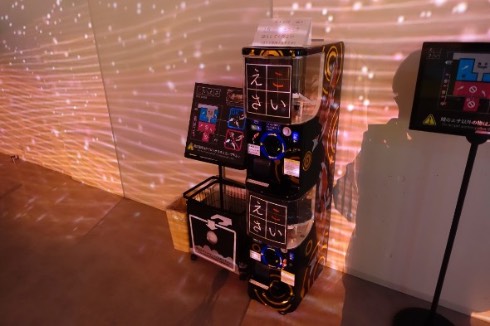 それに合わせて、このエリアで展示されているのもいろいろな種類の金魚たちとなっています。この光の切り絵はなかなか没入感があり、ぼんやり見てるだけでも「すげ〜な〜」という気持ちに。光って動いているところを見るとなおさら、「和と灯」というより「巨大なザイバツ本社ビルのペントハウスの中にある、実際すごいサイバー茶室」という感じがします。