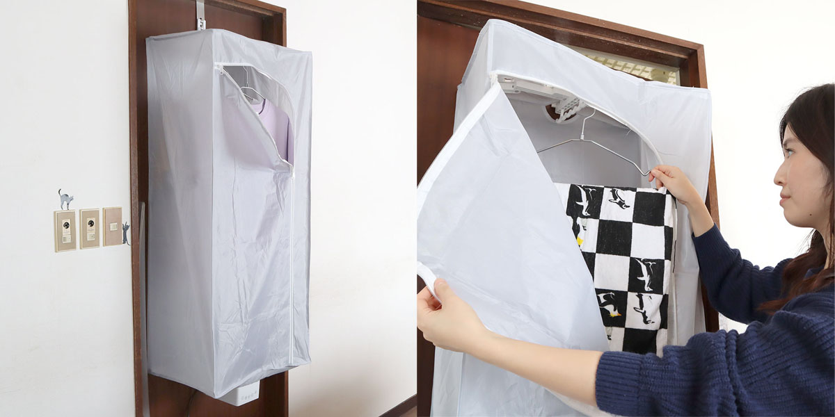 室内で使える衣類乾燥機「パッとドアドライ」。使う時には、まずドアにフックをかけて、服を入れるバッグを設置。それからバッグの下にある乾燥機をセットすれば、乾燥が始まります。