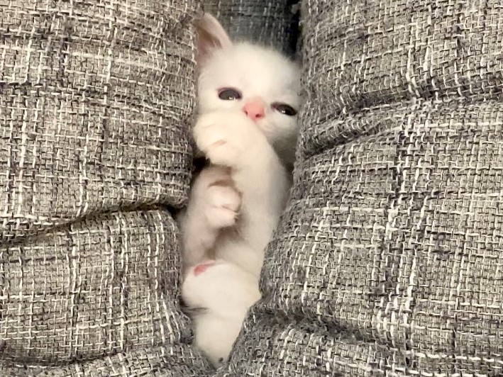 ソファの隙間にはまって毛づくろいする子猫。Twitterに投稿された白くて小さなモフモフのあいらしさに、ハートを容赦なく打ち抜かれます。
