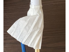 考案者は、日々作画手法を研究している下田スケッチ(@simodasketch)さん。ティッシュペーパーをジャバラに折り、割りばしに巻き付けてプリーツスカートに仕上げました。小さくて取り回しやすく、スソを鉛筆などで持ち上げれば、翻った様子などを自由に形作れます。