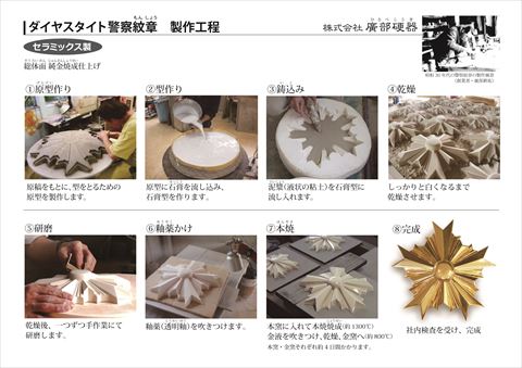 この紋章を作っているのは、福井県福井市にある廣部硬器。従業員15人の会社で、創業は1956年、警察紋章のセラミックス造形から始まりました。