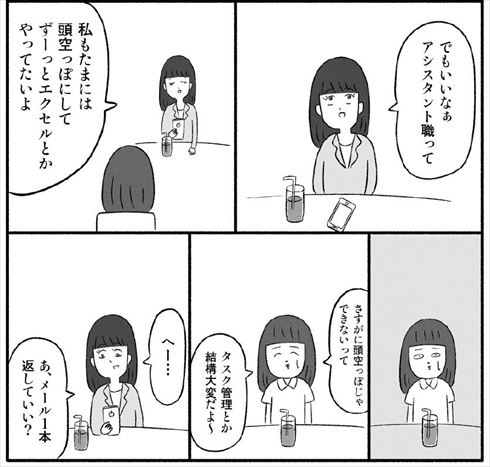 地味ではあるけれども忙しく、しかし周囲には大変さを分かってもらえない仕事。社内では「生産性がない」「代わりがきく」と低く見られ、「アシスタントが営業スタッフを接待する社内行事」まであるほど。社外では学生時代の友人に「私もたまには頭空っぽにしてずーっとエクセルとかやってたいよ」とマウンティングされ……。