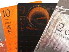 特殊印刷加工によるスペシャルカレンダーで、書体・用紙・印刷の見本帖にもなる仕様です。コスモテックのホログラム箔押し加工の上から、さらに一九堂印刷所による特殊印刷を加えたカレンダーなど、さまざまな印刷技法を駆使して四季折々を表現しています。