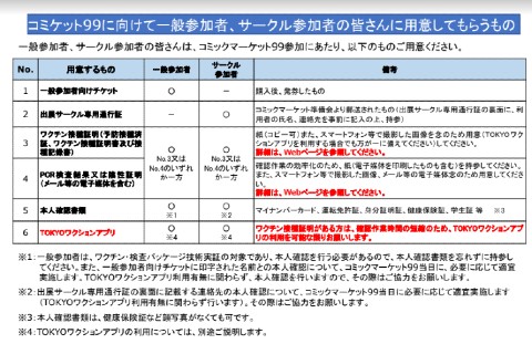 サークル参加者・一般参加者は、サークル通行証または入場チケットに加え、ワクチン接種証明書かPCR検査結果または陰性証明、本人確認書類が必要となります。またワクチン接種証明を持っている人は、可能な限り「TOKYOワクション」アプリを利用してほしいと求めています。
